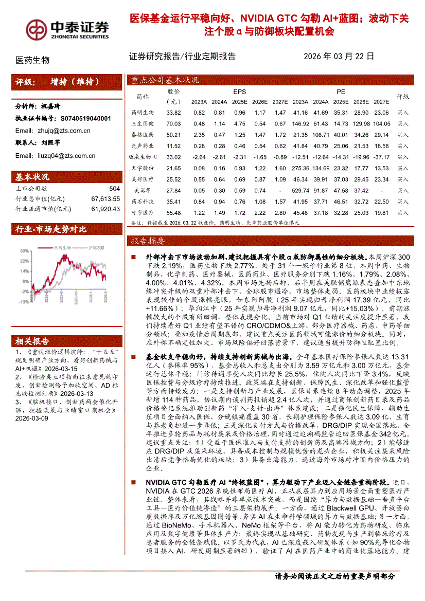 医药生物行业:中泰证券-医药生物行业:医保基金运行平稳向好、NVIDIAGTC勾勒AI+蓝图;波动下关注个股α与防御板块配置机会-260322