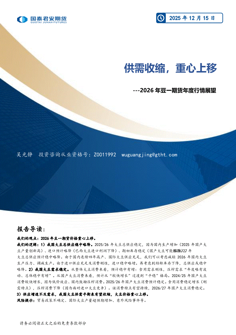 国泰君安期货-2026年豆一期货年度行情展望:供需收缩,重心上移-251215