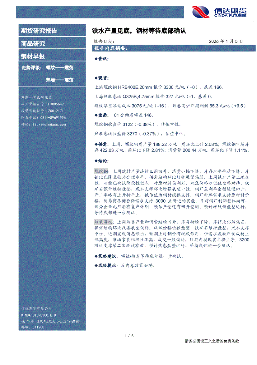 信达期货-钢材早报:铁水产量见底,钢材等待底部确认-260106