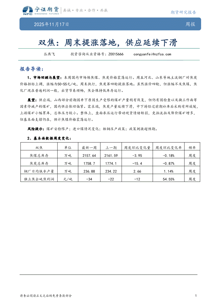 宁证期货-双焦:周末提涨落地,供应延续下滑-251117