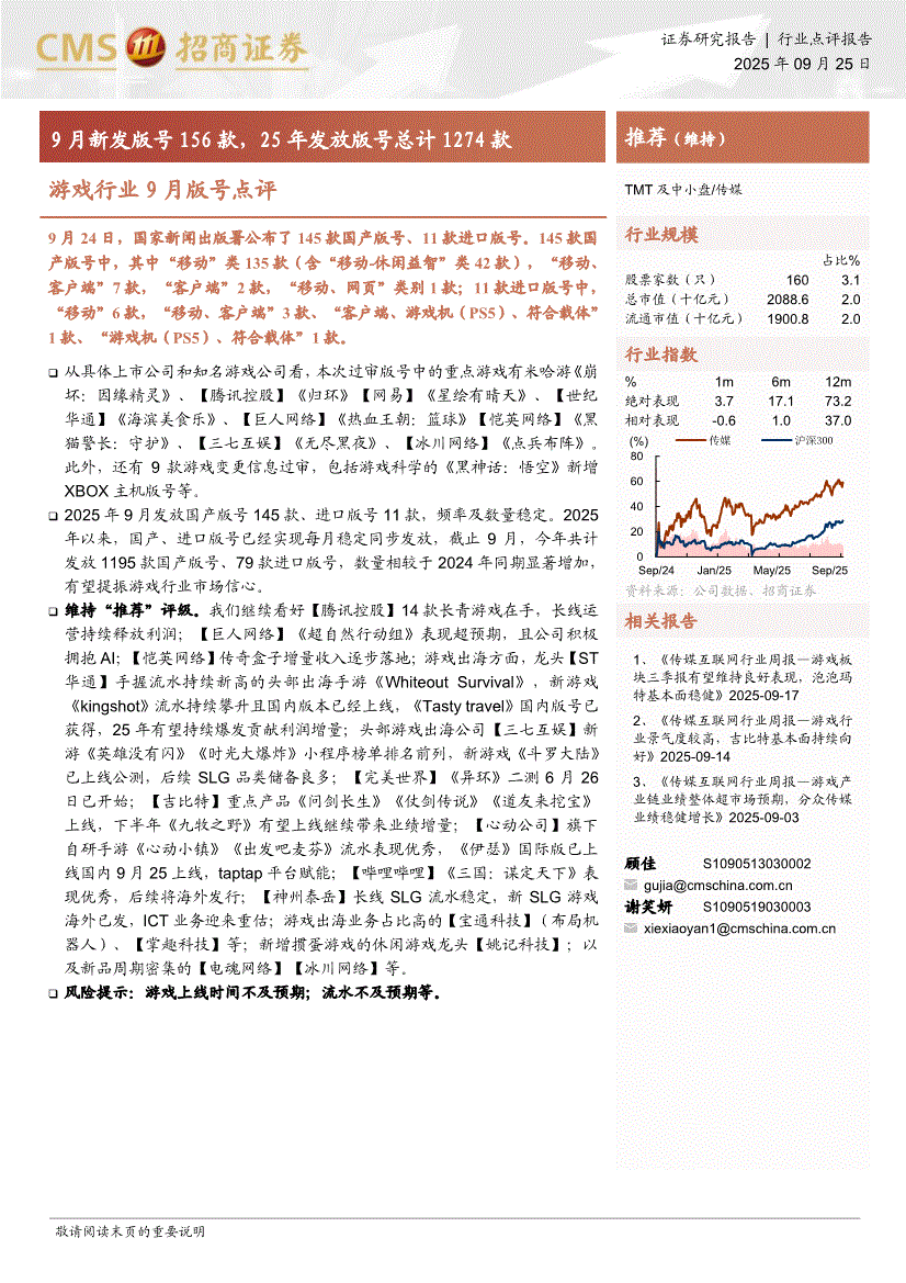 游戏行业:招商证券-游戏行业9月版号点评:9月新发版号156款,25年发放版号总计1274款-250925