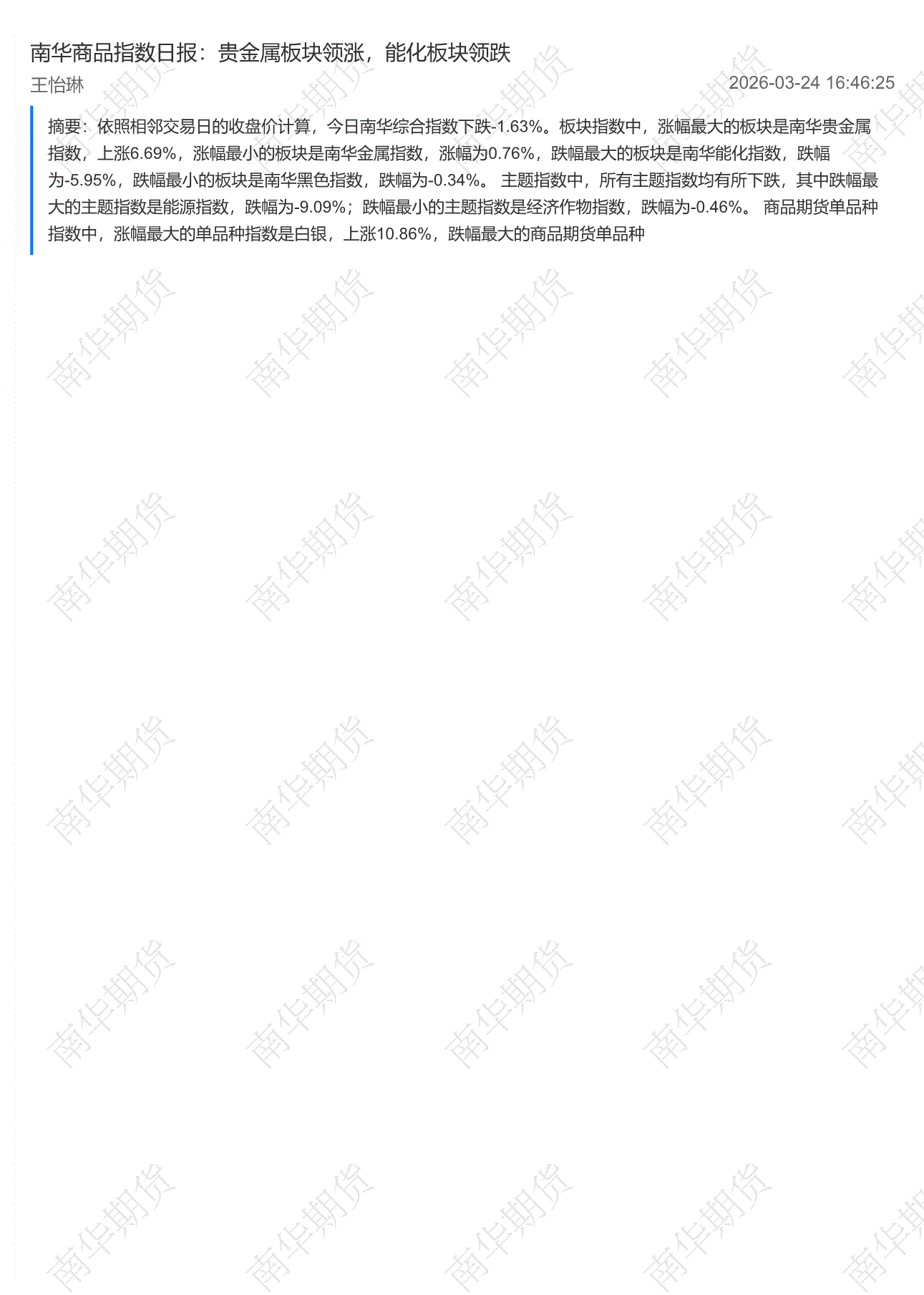 南华期货-商品指数日报:贵金属板块领涨,能化板块领跌-260324