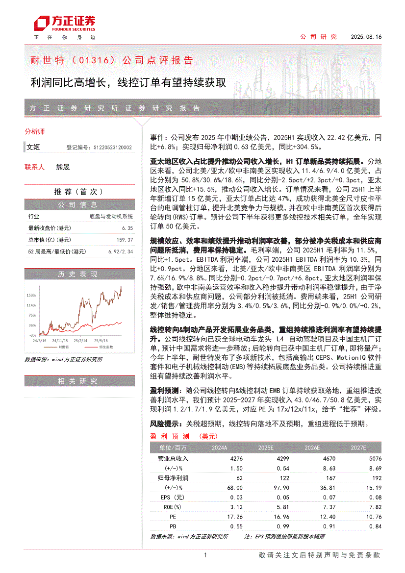 耐世特:方正证券-耐世特-1316.HK-公司点评报告:利润同比高增长,线控订单有望持续获取-250816