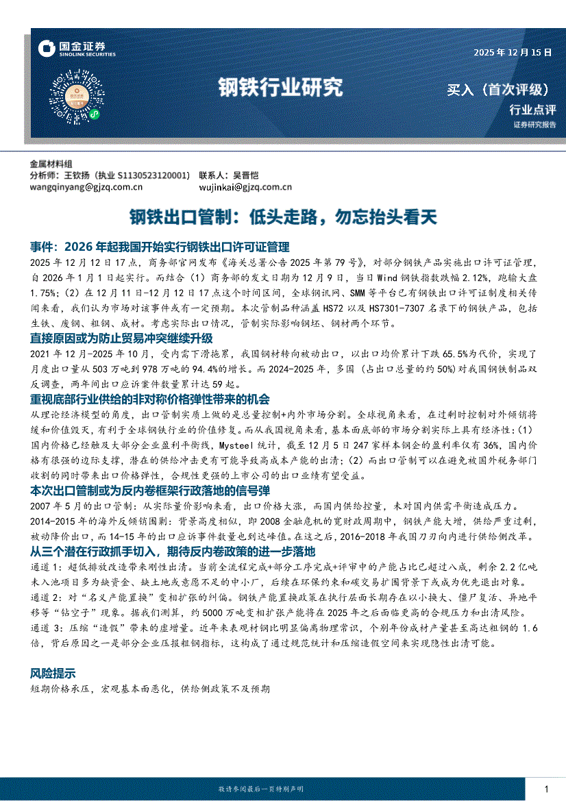 钢铁行业:国金证券-钢铁行业点评:钢铁出口管制,低头走路,勿忘抬头看天-251215
