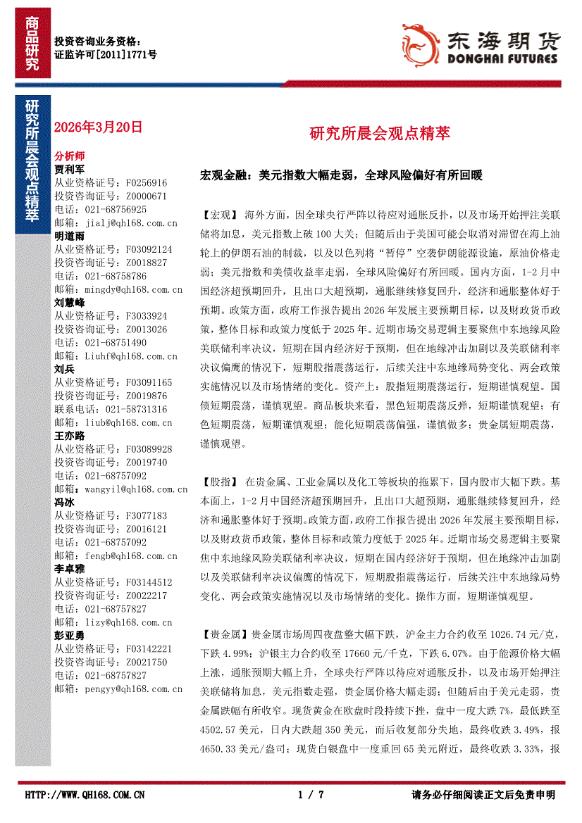 东海期货-研究所晨会观点精萃-260320