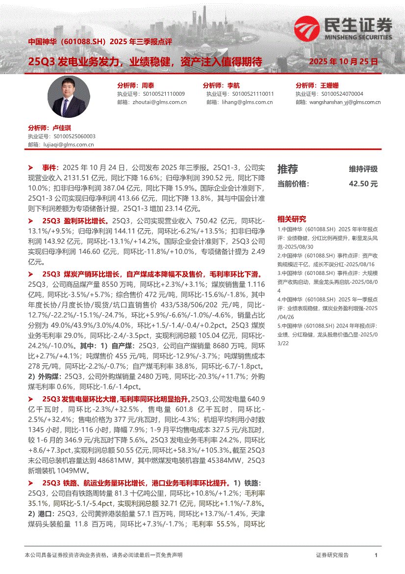 中国神华:民生证券-中国神华-601088-2025年三季报点评:25Q3发电业务发力,业绩稳健,资产注入值得期待-251025