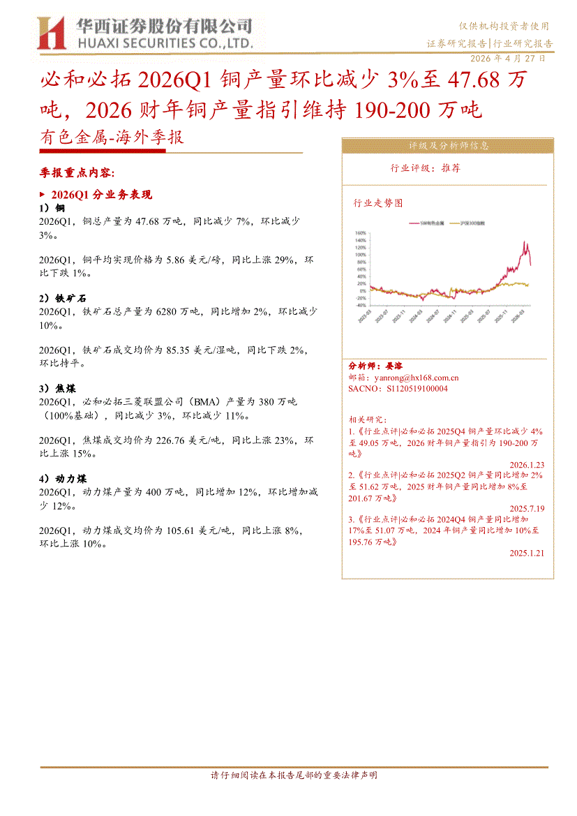 有色金属行业:华西证券-有色金属行业~海外季报:必和必拓2026Q1铜产量环比减少3%至47.68万吨,2026财年铜产量指引维持190~200万吨-260427