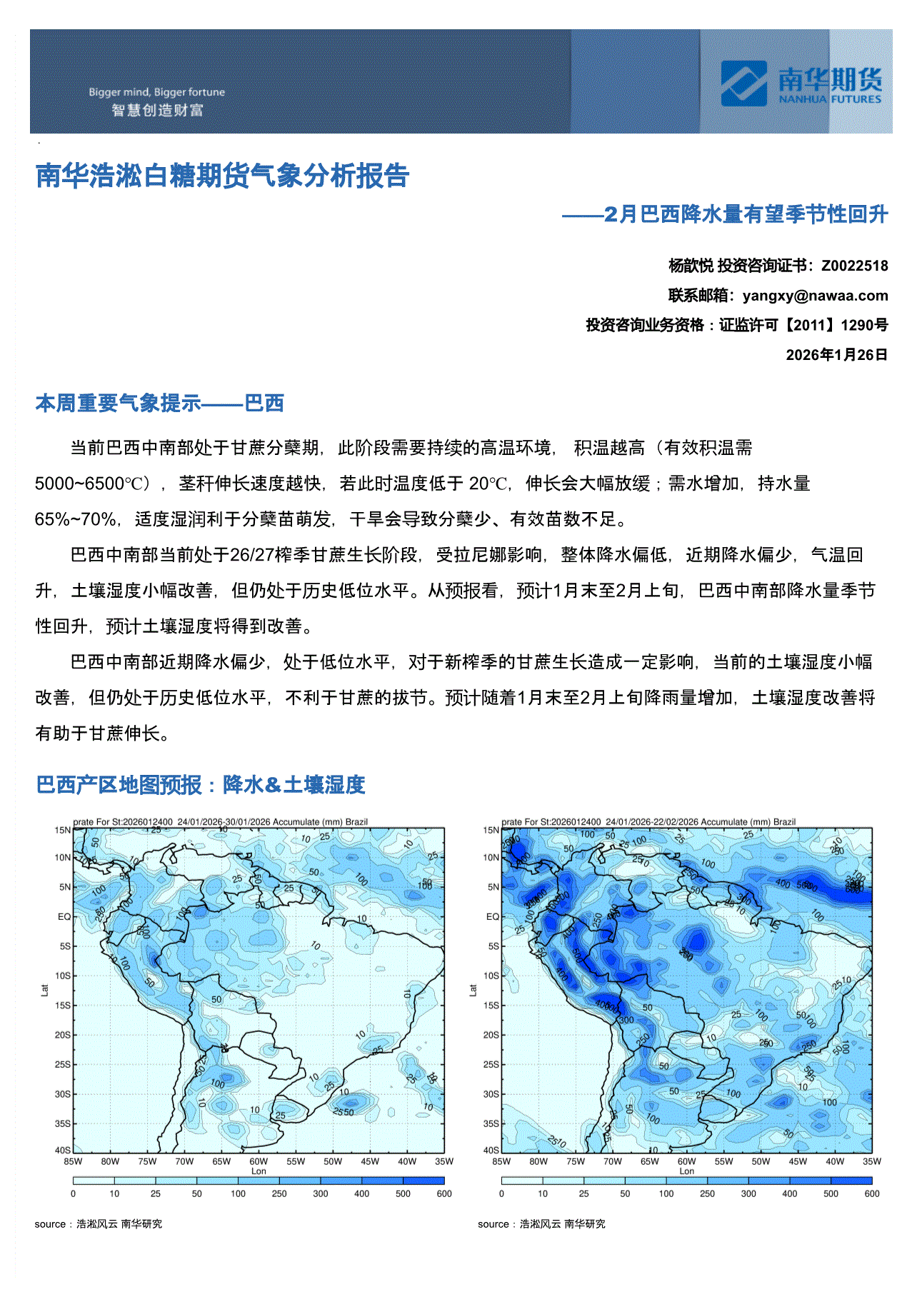 南华期货-浩淞白糖期货气象分析报告:2月巴西降水量有望季节性回升-260126