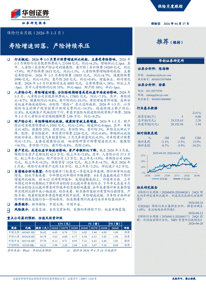 保险行业:华创证券-保险行业月报(2026年1~3月):寿险增速回落,产险持续承压-260427
