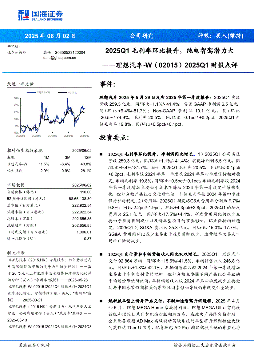 理想汽车~W:国海证券-理想汽车~W-2015.HK-2025Q1财报点评:2025Q1毛利率环比提升,纯电智驾潜力大-250602