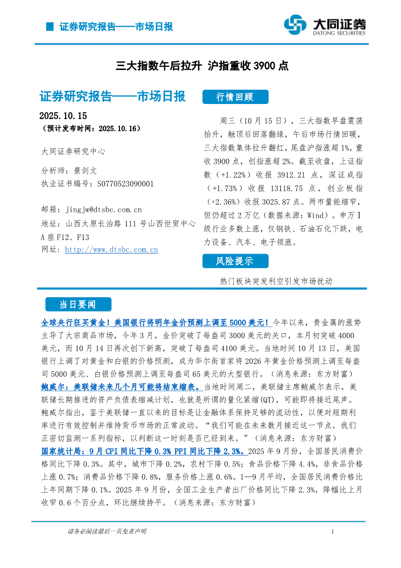 大同证券-市场日报:三大指数午后拉升,沪指重收3900点-251015
