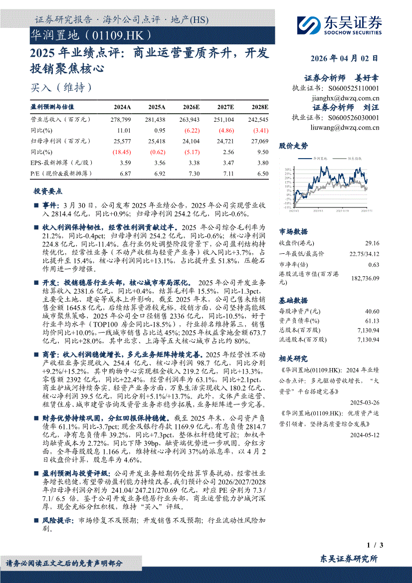 华润置地:东吴证券-华润置地-1109.HK-2025年业绩点评:商业运营量质齐升,开发投销聚焦核心-260402