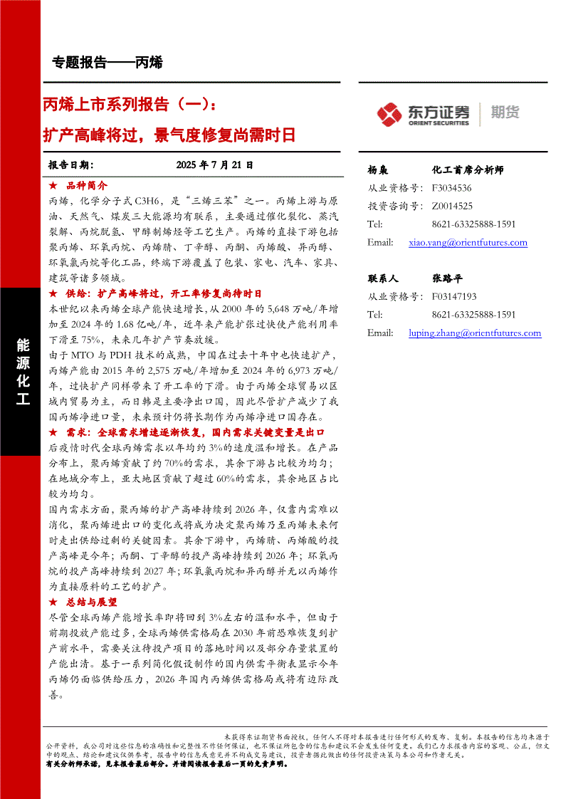 东证期货-丙烯上市系列报告(一):扩产高峰将过,景气度修复尚需时日-250721