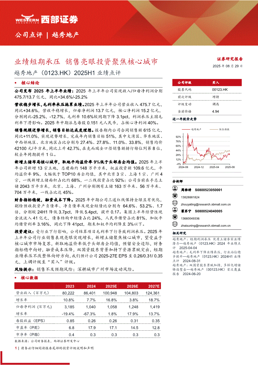 越秀地产:西部证券-越秀地产-0123.HK-2025H1业绩点评:业绩短期承压,销售亮眼投资聚焦核心城市-250829