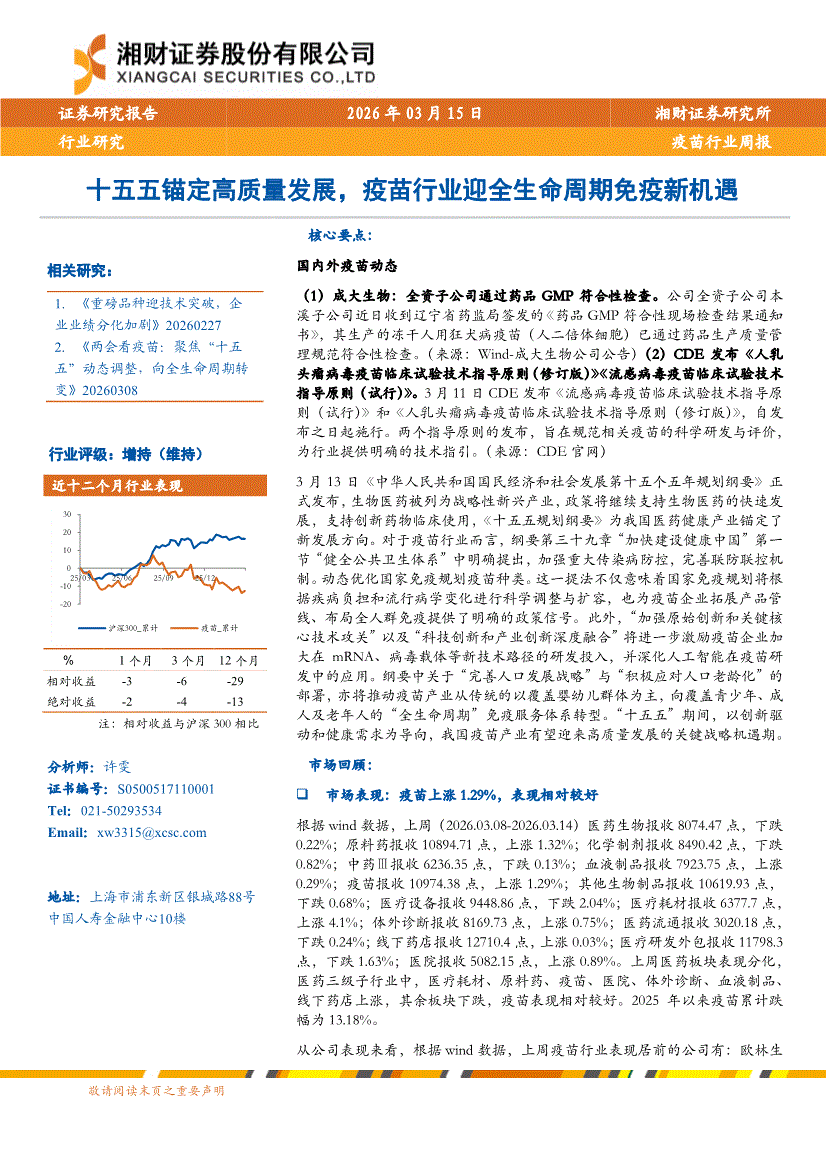 疫苗行业:湘财证券-疫苗行业周报:十五五锚定高质量发展,疫苗行业迎全生命周期免疫新机遇-260315
