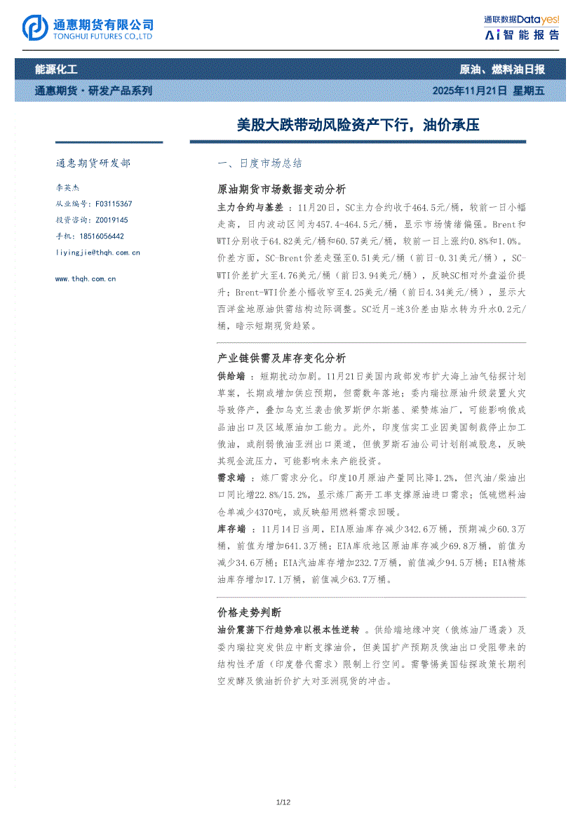 通惠期货-原油、燃料油日报:美股大跌带动风险资产下行,油价承压-251121