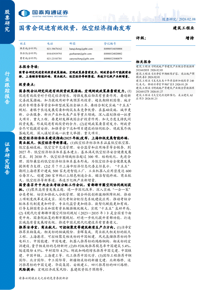 建筑工程行业:国泰海通证券-建筑工程行业:国常会促进有效投资,低空经济指南发布-260208