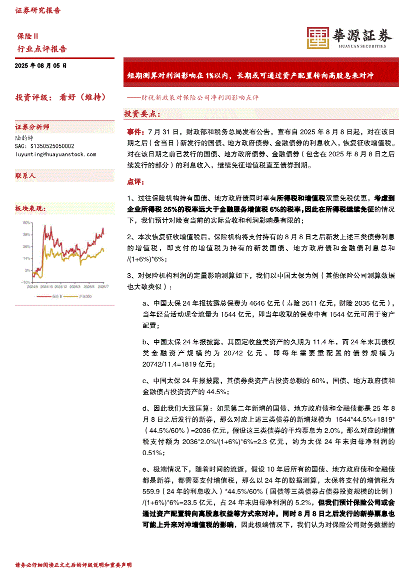 保险行业:华源证券-保险行业财税新政策对保险公司净利润影响点评:短期测算对利润影响在1%以内,长期或可通过资产配置转向高股息来对冲-250805