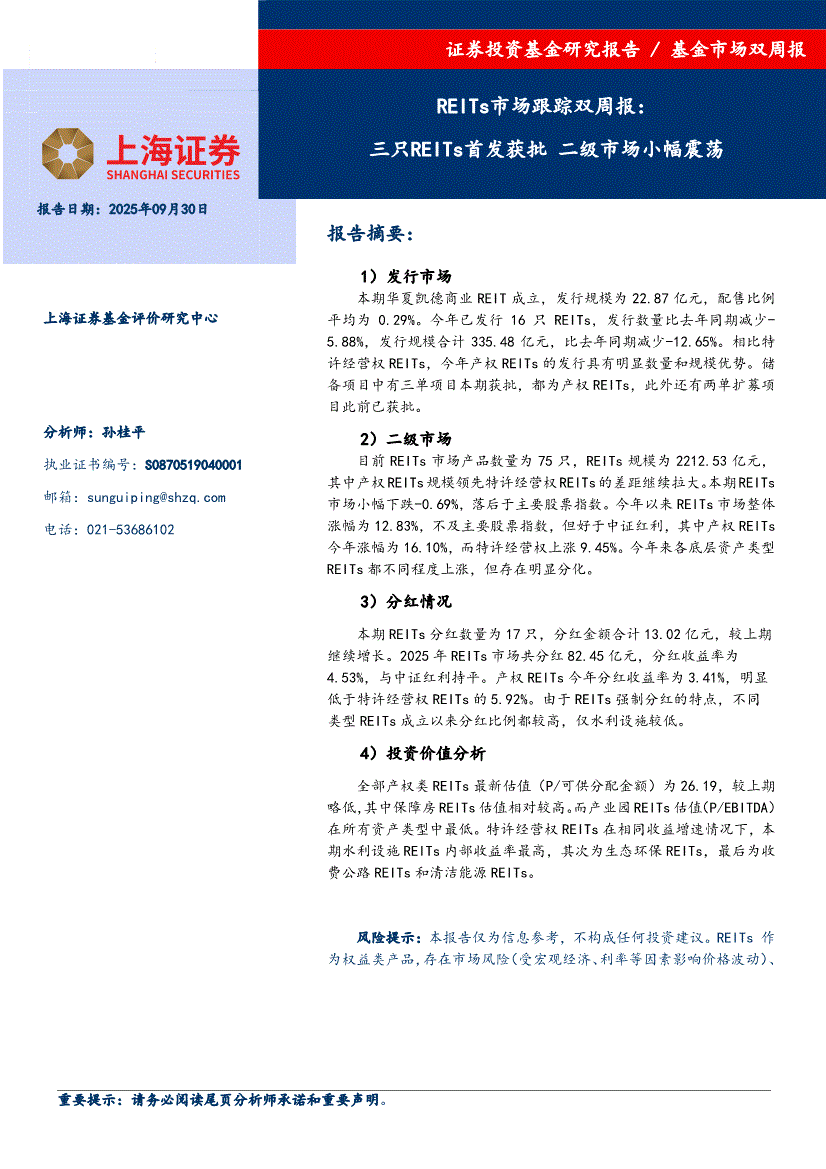 上海证券-REITs市场跟踪双周报:三只REITs首发获批二级市场小幅震荡-250930