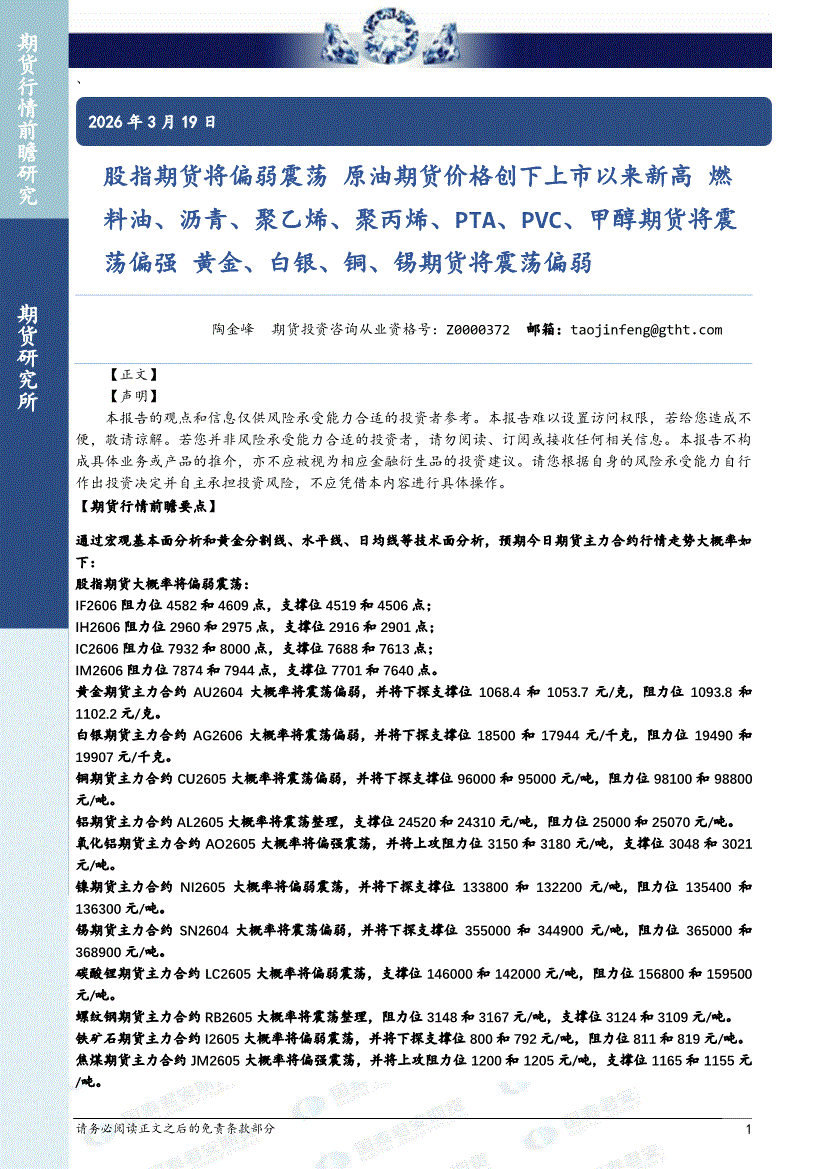 国泰君安期货-股指期货将偏弱震荡,原油期货价格创下上市以来新高,燃料油、沥青、聚乙烯、聚丙烯、PTA、PVC、甲醇期货将震荡偏强,黄金、白银、铜、锡期货将震荡偏弱-260319
