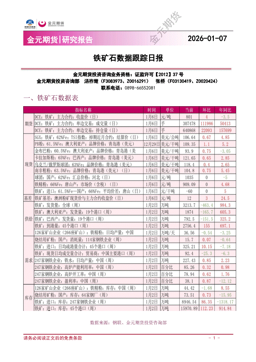 金元期货-螺纹钢产业链数据跟踪日报-260107
