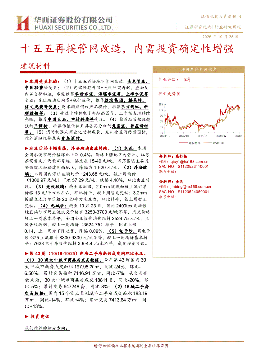 建筑材料行业:华西证券-建筑材料行业研究周报:十五五再提管网改造,内需投资确定性增强-251026