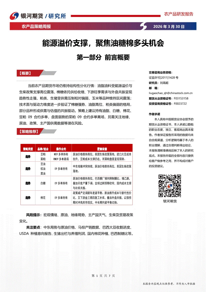 银河期货-农产品策略周报:能源溢价支撑,聚焦油糖棉多头机会-260330