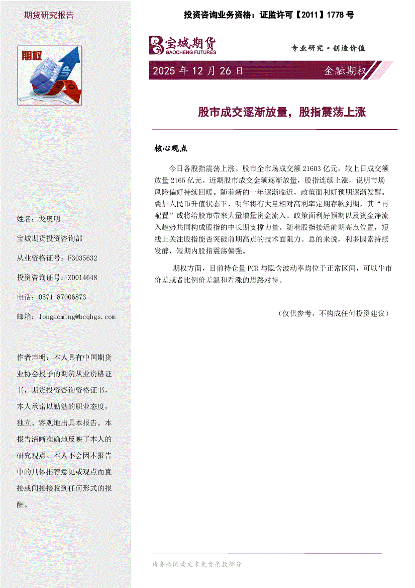 宝城期货-金融期权日报:股市成交逐渐放量,股指震荡上涨-251226