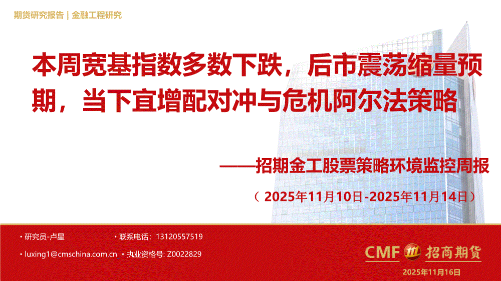 招商期货-金工股票策略环境监控周报:本周宽基指数多数下跌,后市震荡缩量预期,当下宜增配对冲与危机阿尔法策略-251116