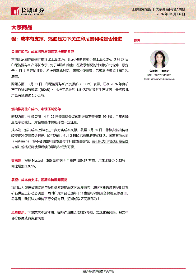 长城证券-大宗商品:镍,成本有支撑,燃油压力下关注印尼暴利税是否推进-260406