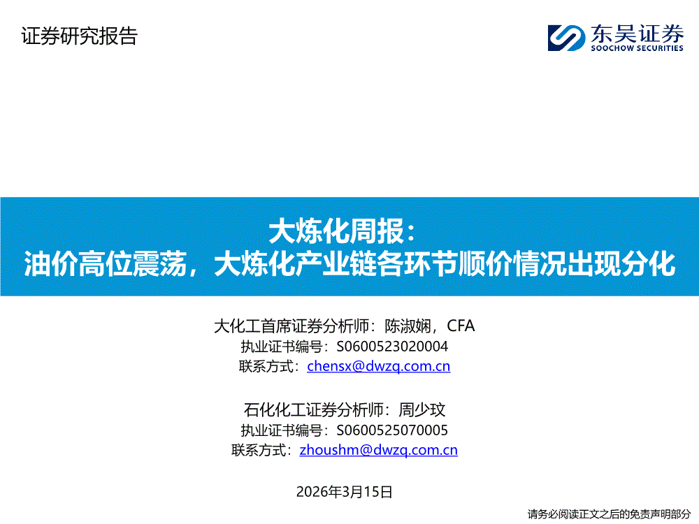 石化化工行业:东吴证券-石化化工行业大炼化周报:油价高位震荡,大炼化产业链各环节顺价情况出现分化-260315