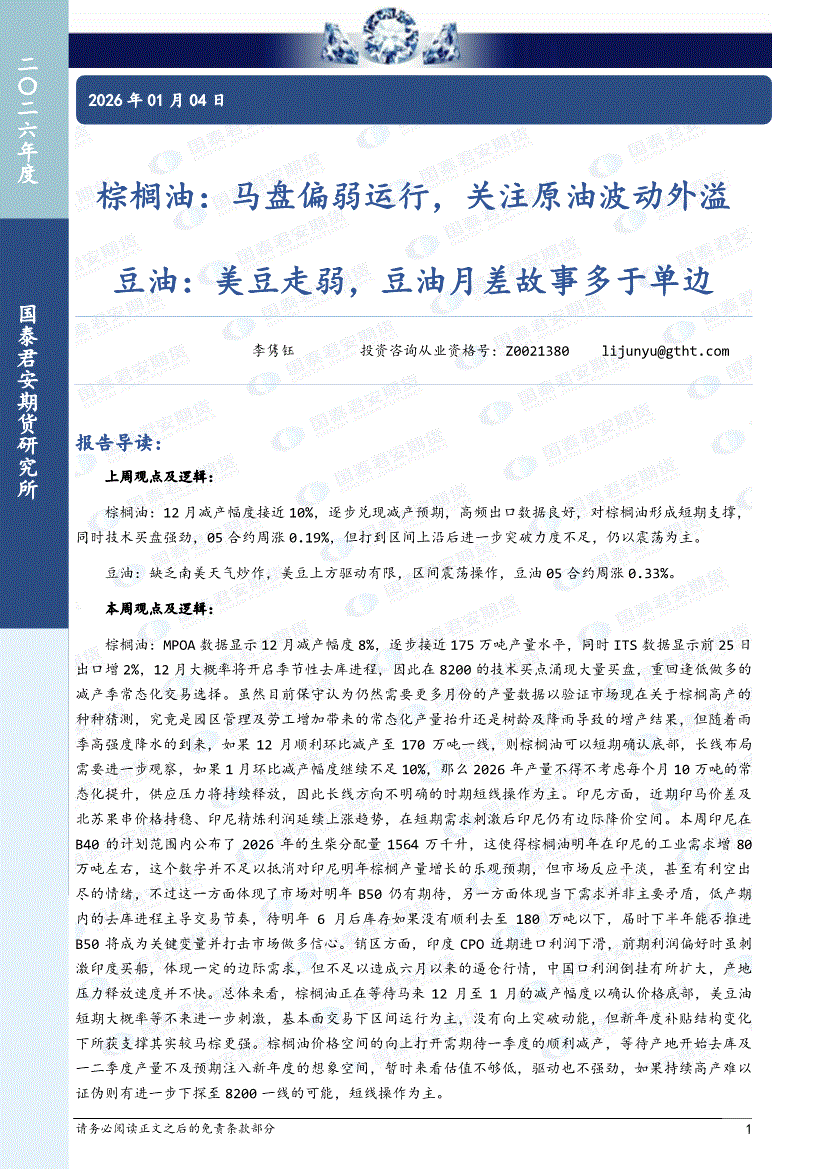 国泰君安期货-棕榈油:基本面驱动不强,关注宏观情绪影响,豆油,单边区间为主,关注月差机会-260107