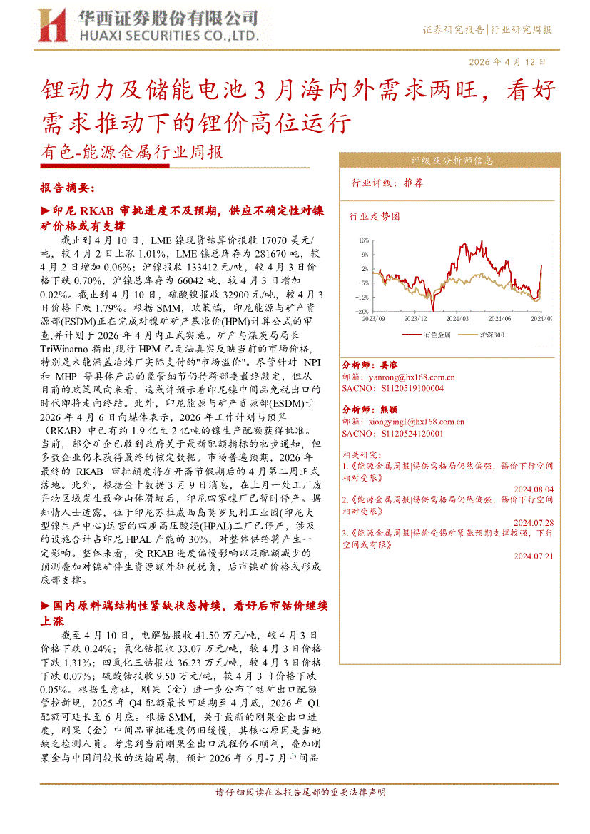 有色~能源金属行业:华西证券-有色~能源金属行业周报:锂动力及储能电池3月海内外需求两旺,看好需求推动下的锂价高位运行-260412