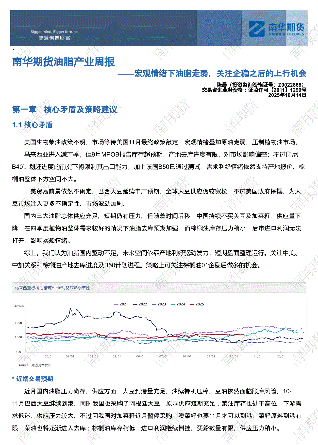 南华期货-油脂产业周报:宏观情绪下油脂走弱,关注企稳之后的上行机会-251014