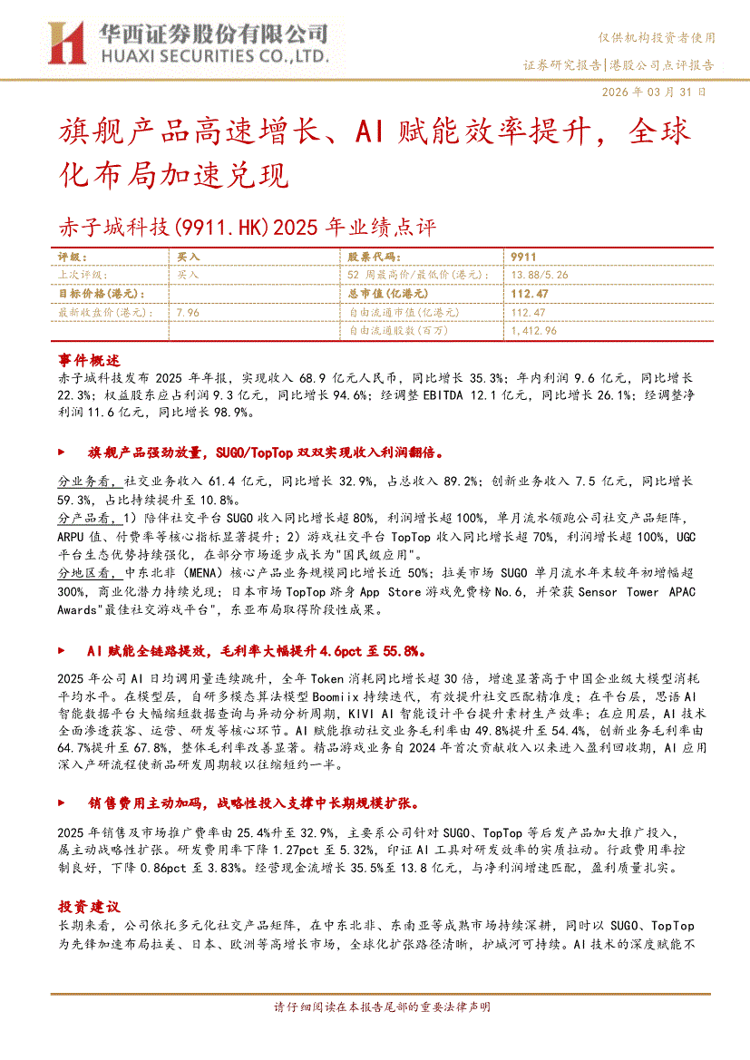赤子城科技:华西证券-赤子城科技-9911.HK-2025年业绩点评:旗舰产品高速增长、AI赋能效率提升,全球化布局加速兑现-260331