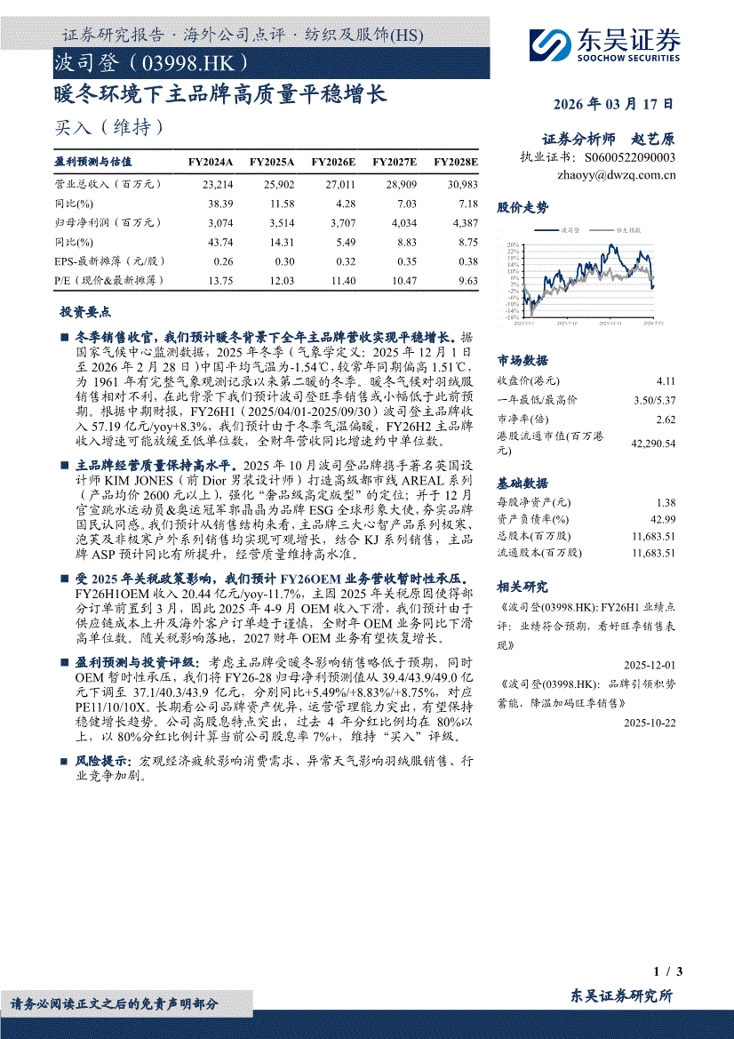 波司登:东吴证券-波司登-3998.HK-暖冬环境下主品牌高质量平稳增长-260317