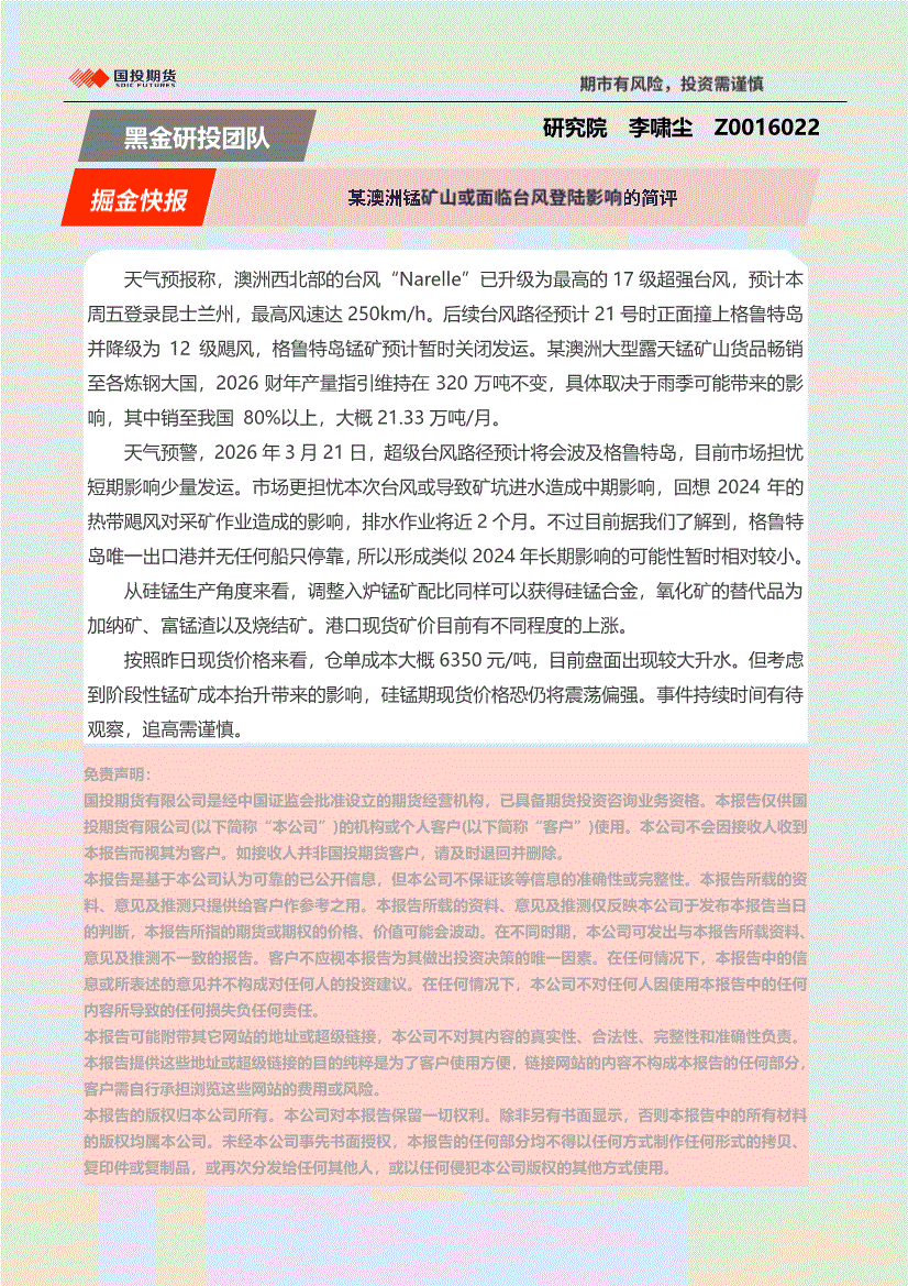 国投期货-掘金快报:某澳洲锰矿山或面临台风登陆影响的简评-260320