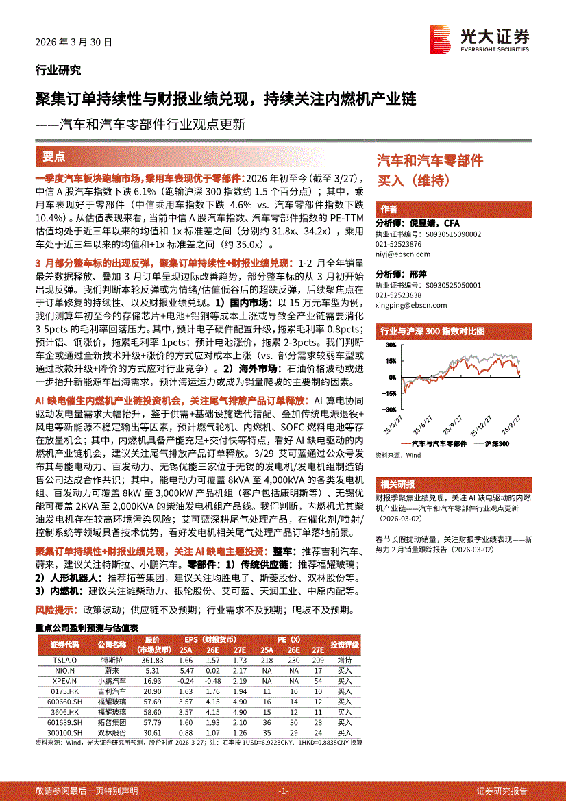 汽车和汽车零部件行业:光大证券-汽车和汽车零部件行业观点更新:聚集订单持续性与财报业绩兑现,持续关注内燃机产业链-260330