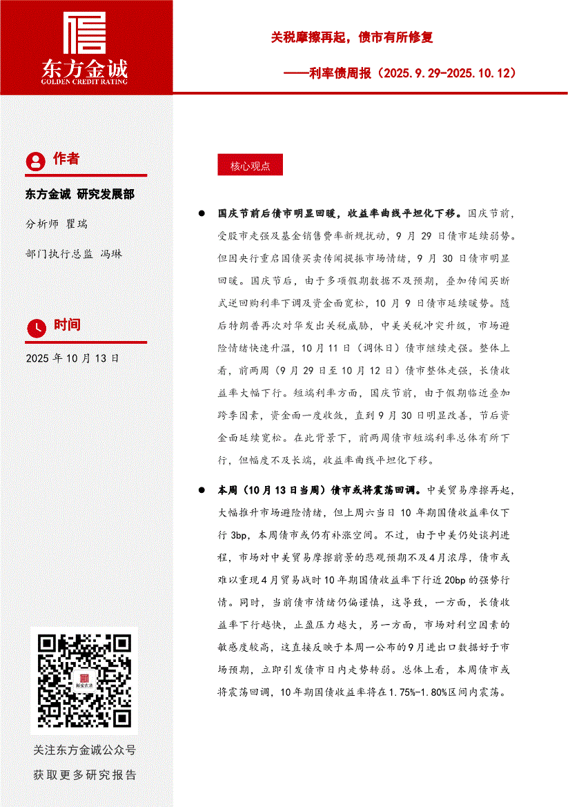 东方金诚-利率债周报:关税摩擦再起,债市有所修复-251013