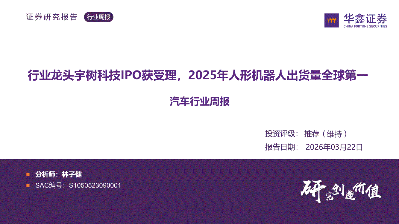 汽车行业:华鑫证券-汽车行业周报:行业龙头宇树科技IPO获受理,2025年人形机器人出货量全球第一-260322