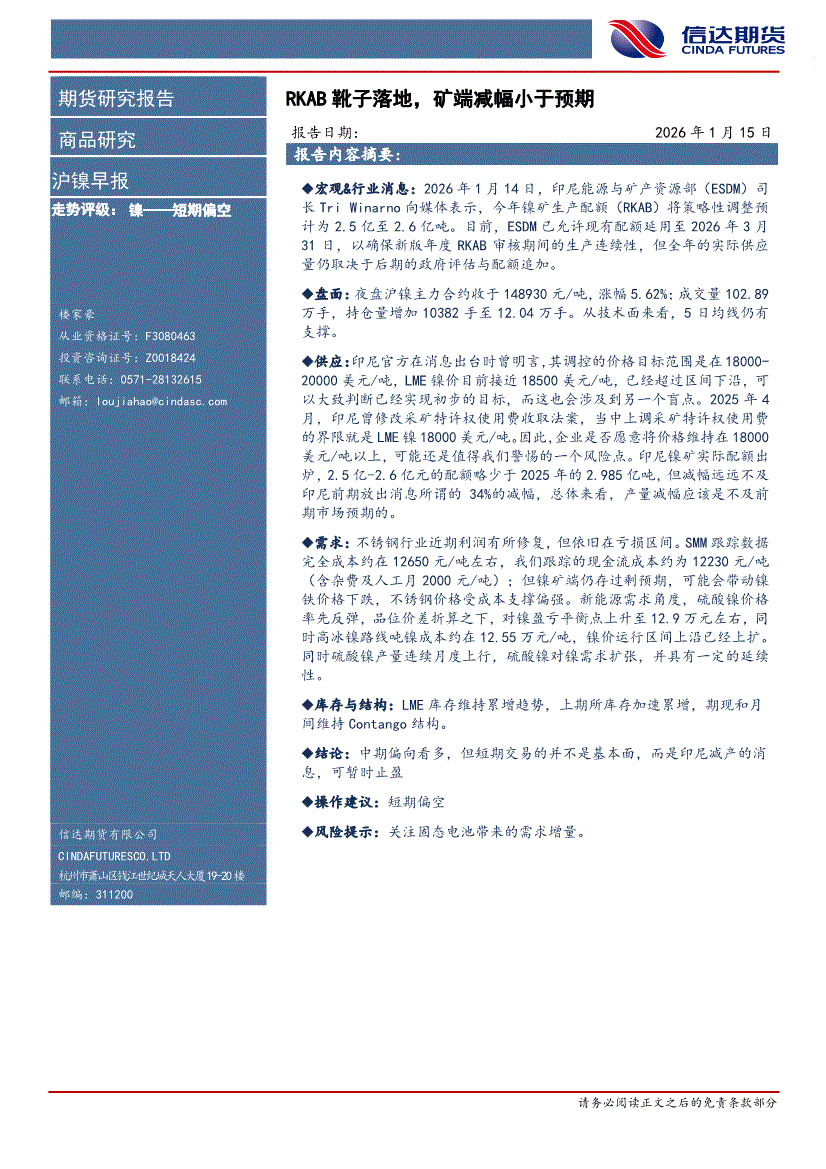 信达期货-沪镍早报:RKAB靴子落地,矿端减幅小于预期-260115
