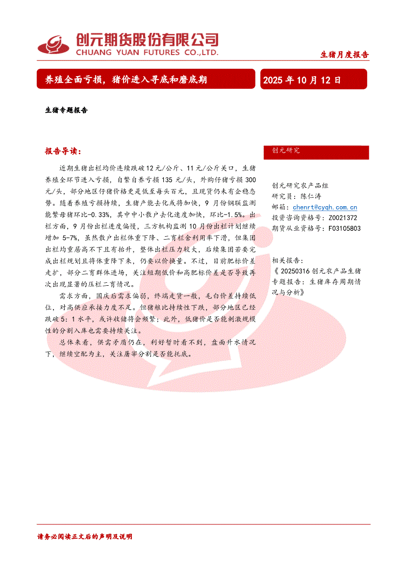 创元期货-生猪专题报告:养殖全面亏损,猪价进入寻底和磨底期-251012