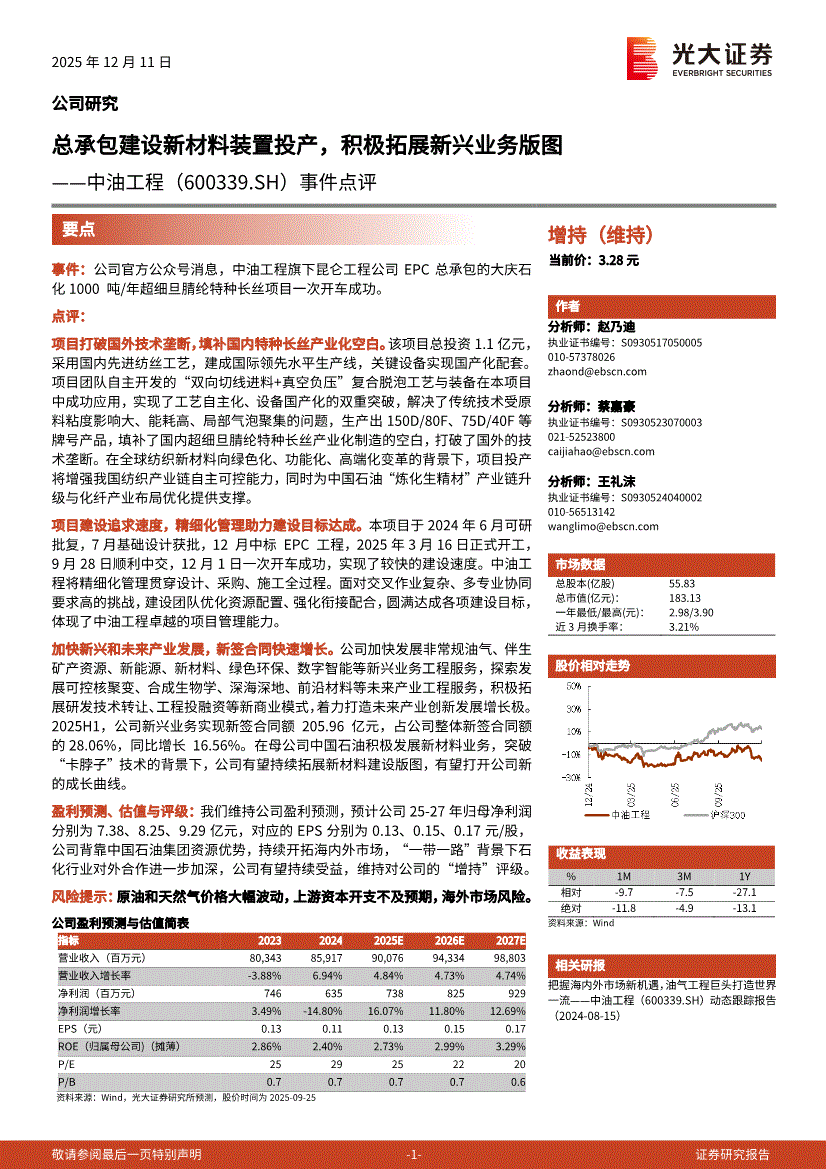 中油工程:光大证券-中油工程-600339-事件点评:总承包建设新材料装置投产,积极拓展新兴业务版图-251211