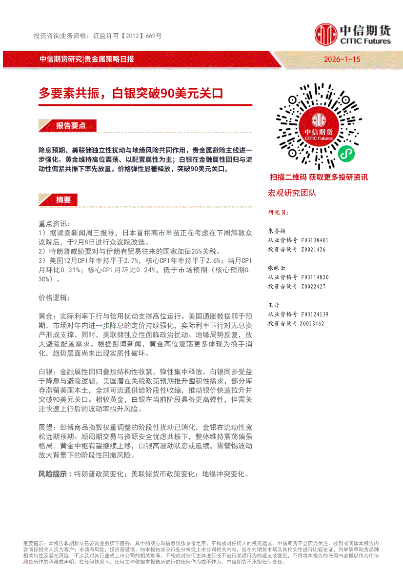 中信期货-贵金属策略日报:多要素共振,白银突破90美元关口-260115