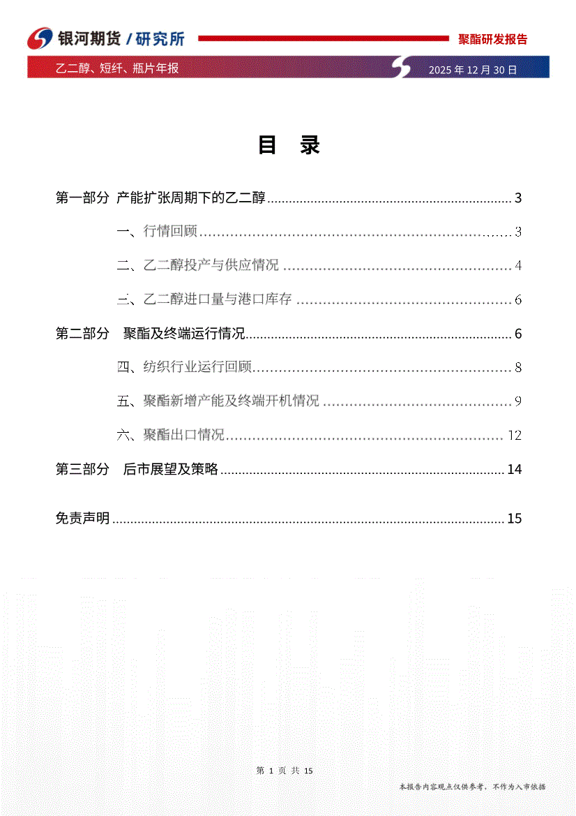 银河期货-乙二醇、短纤、瓶片年报:乙二醇扩产周期下供应压力大,聚酯产能增速放缓-251230
