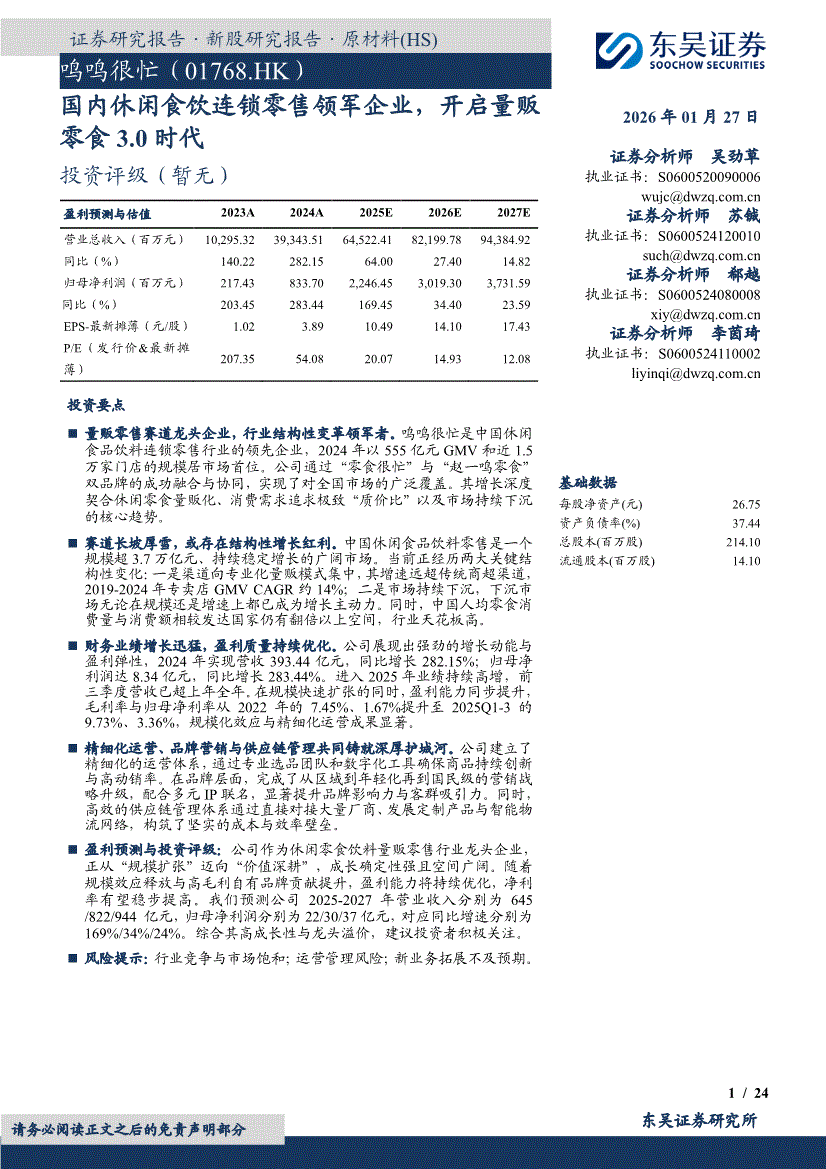 鸣鸣很忙:东吴证券-鸣鸣很忙-1768.HK-国内休闲食饮连锁零售领军企业,开启量贩零食3.0时代-260127