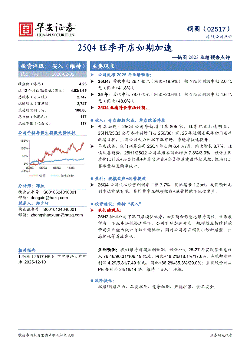 锅圈:华安证券-锅圈-2517.HK-2025业绩预告点评:25Q4旺季开店如期加速-260202