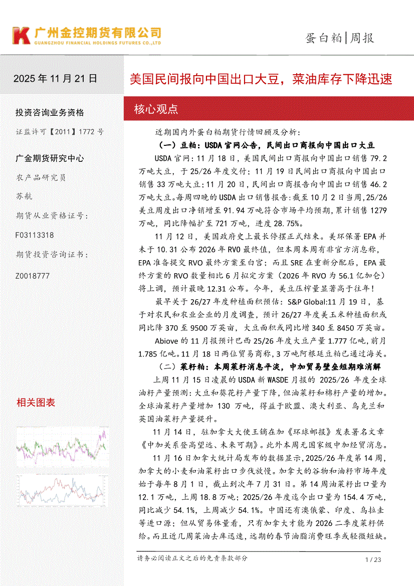 广金期货-蛋白粕周报:美国民间报向中国出口大豆,菜油库存下降迅速-251121