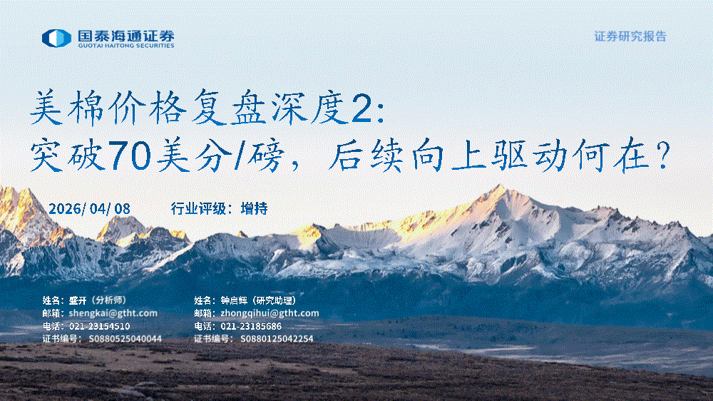 纺织行业:国泰海通证券-纺织行业美棉价格复盘深度2:突破70美分/磅,后续向上驱动何在?-260408