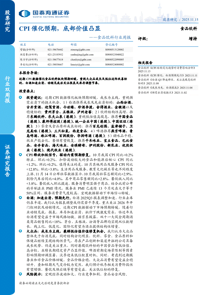 食品饮料行业:国泰海通证券-食品饮料行业周报:CPI催化预期,底部价值凸显-251115